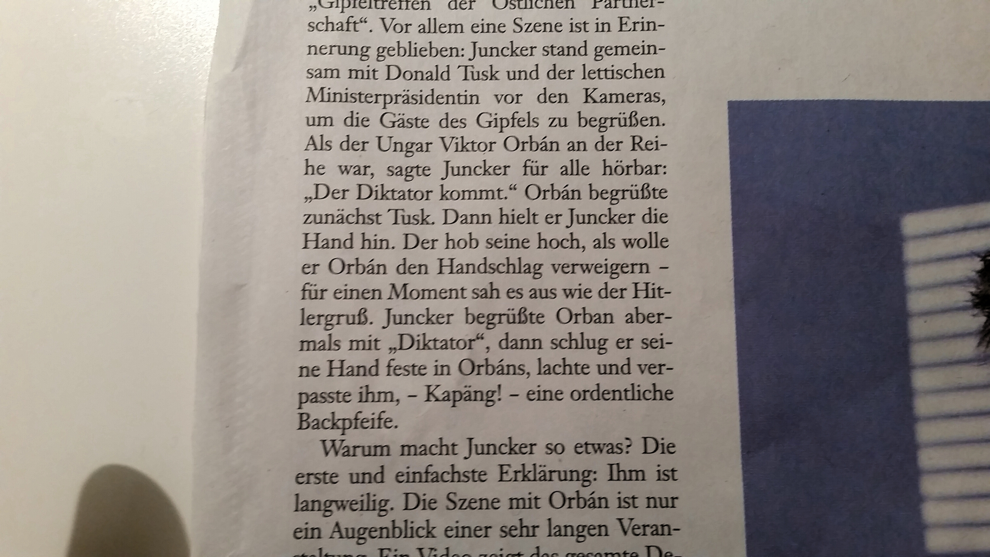 Bin ich eigentlich ein Rebell, wenn ich die Sonntagszeitung montags lese? Nein, ich habe das Konzept Zeitung einfach nur verstanden und es wäre mir ansonsten obiger Artikel-Ausschnitt entgangen, der Jean-Claude Junckers Vorliebe für Körperkontakt und einen gewissen Humor zum Gegenstand hat.