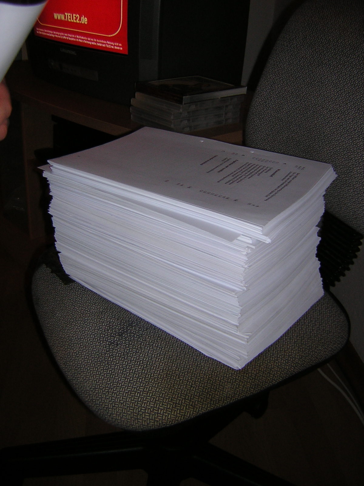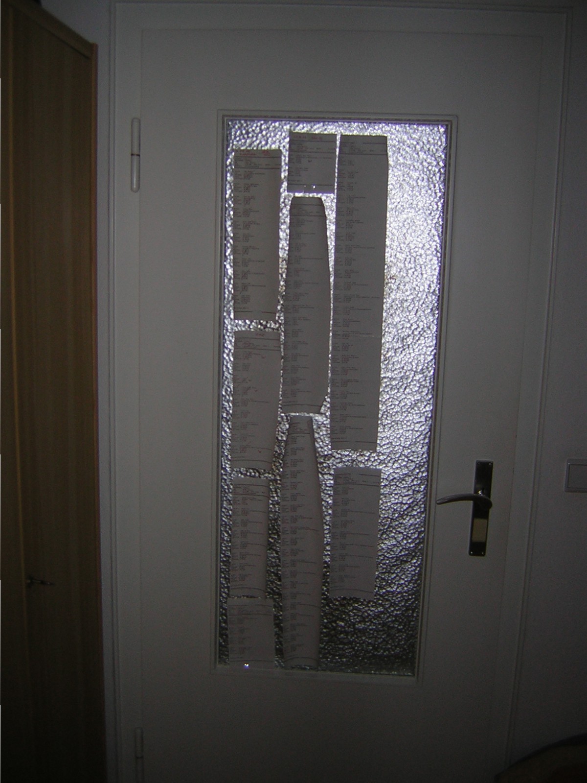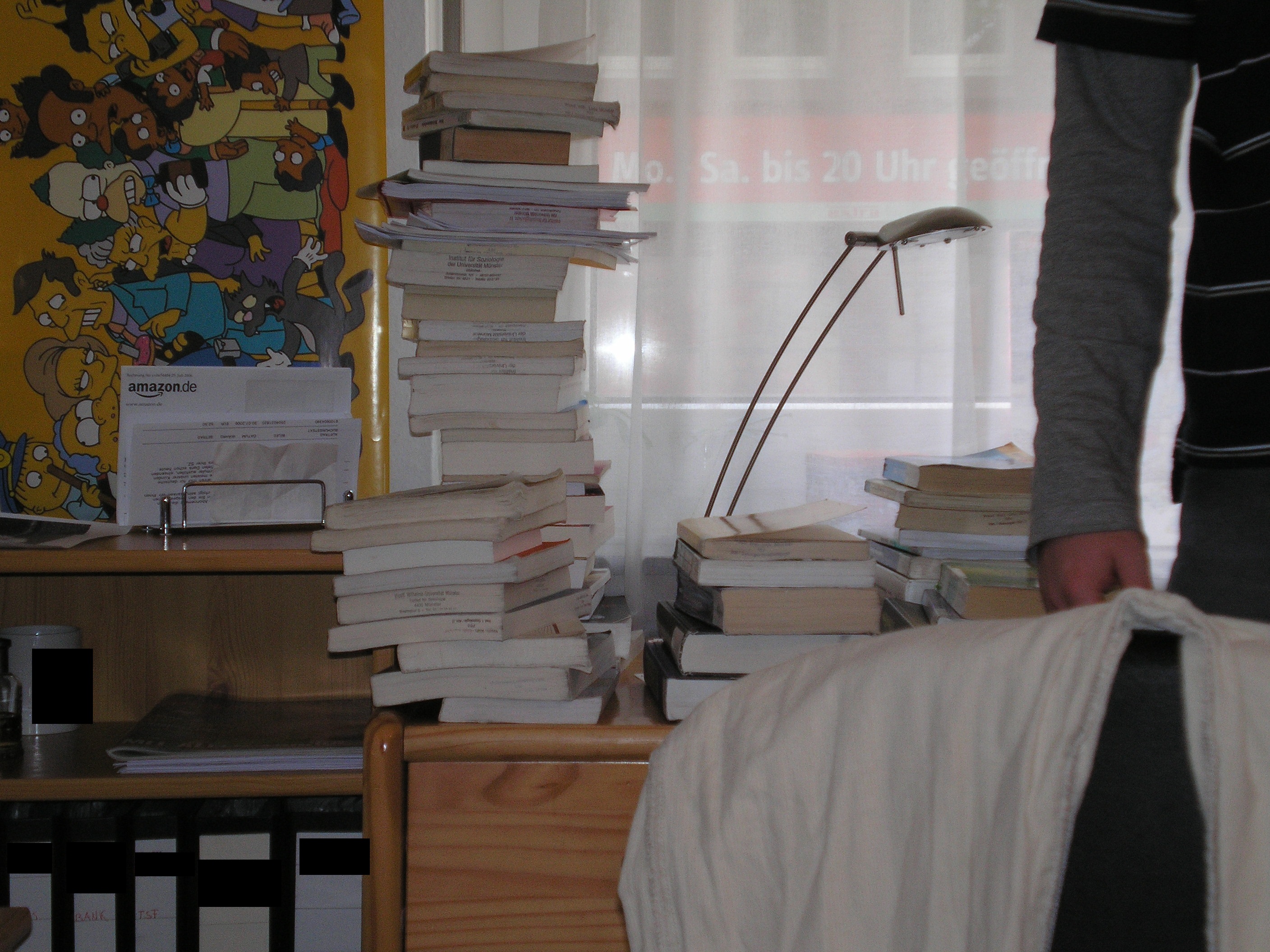Meine Ausleihlisten an der stümpferhaft aber effektiv verdunkelten Tür. Irgendwann verlor ich den Überblick und brachte am Ende sämtliche Sekundär- und Tertiär-Literatur wieder zurück und stapelte hoch, nämlich alle meiner Probeausdrucke der Arbeit:
