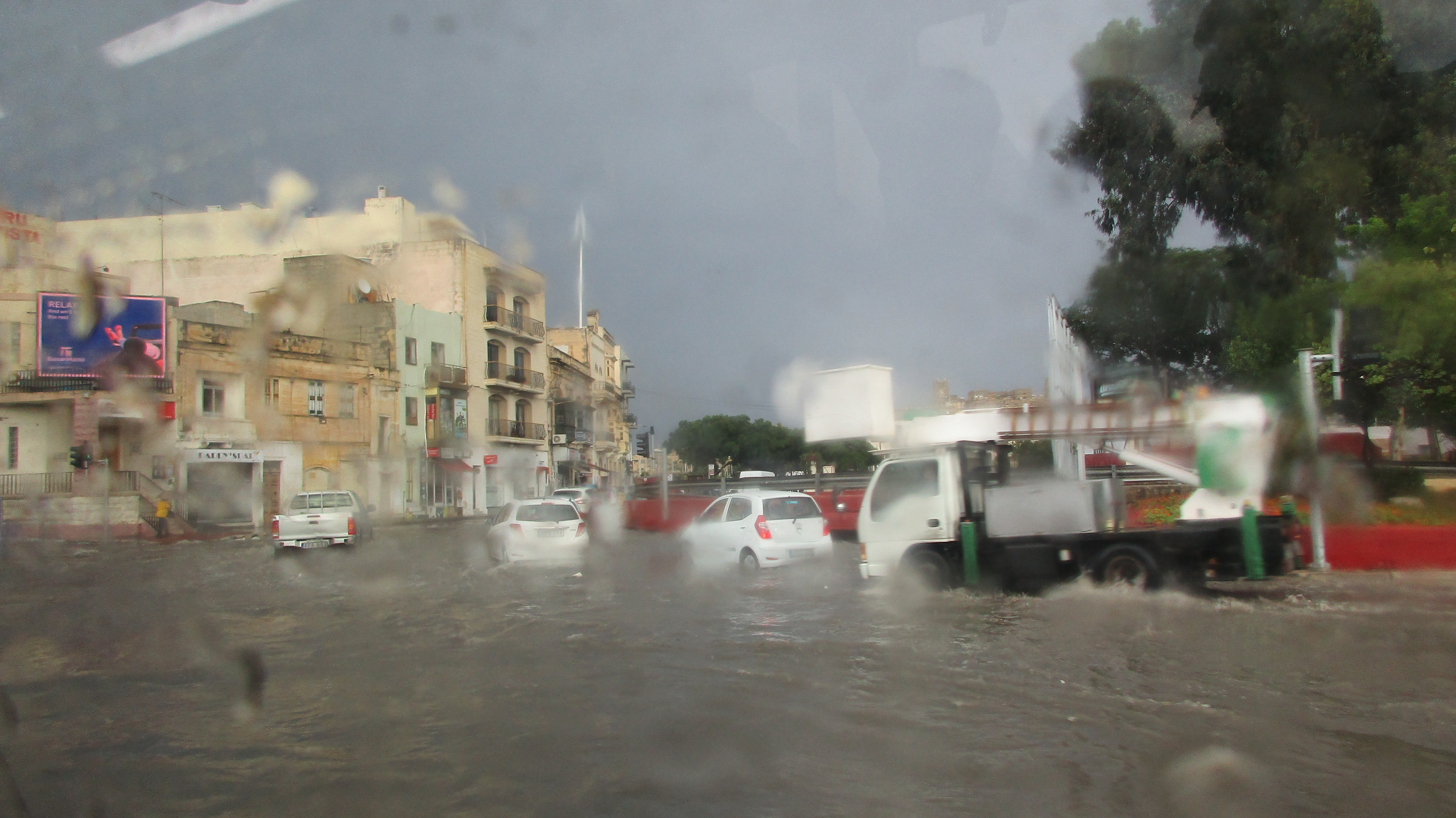 Die Rückfahrt war lustig, denn erstmals in diesem Urlaub kam es zu einem Wetterphänomen, das die Einheimischen „rain“ nennen. Es war mein erstes Sommergewitter in diesem Jahr und es war heftig. Vor allem die Folgen. Wir konnten uns das Ganze aus dem Bus heraus ansehen, und zwar im Sitzen. Anders als jene Familie aus unserem Hotel waren wir halt wieder pünktlich, wohingegen die Familie es sich im Mittelgang gemütlich machen musste. Weil ich vom achtstündigen Durchwandern Vallettas körperlich gebrochen war und ein Führer mich irregeleitet hatte, sah ich mich dieses Mal moralisch auf der absolut richtigen Seite. Und ich wollte im Sitzen betrachten, was der plötzliche Monsun aus Vallettas Straßen macht: