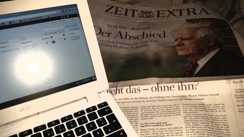 Am Dienstag verstarb Helmut Schmidt. Damit beschäftige ich mich gerade und lese jetzt erst das „Zeit Extra“, in dem mich ein Artikel beinahe zu Tränen gerührt hat. (Übrigens hätte die „Zeit“ ja ruhig mal kommunizieren können, dass man sich „Zeit Extra“ nicht extra kaufen muss, da es neben dem Einzelverkauf auch der „Zeit“ beiliegt. Ich habe nun zwei „Zeit Extra“!) Warum eigentlich?! Ich kannte ihn ja gar nicht persönlich. Genau so wenig wie so viele andere, die auf Facebook am Dienstag mit entsprechenden „Posts“ reagierten, als sei ein persönlicher Freund verstorben. Ich habe ein gespaltenes Verhältnis zu der Anteilnahme, die in sozialen Medien stattfindet. Weil sie übertrieben ist. Weil sie bei vielen nicht mehr als Show ist. Der Mann ist 96 geworden. Es ist nicht schön, dass er ging, aber nun auch keine Überraschung. Es ist kein menschliches Drama. Aber sicherlich ein Verlust eines Beobachters. Er selbst hat zuletzt gesagt: „Die nächste Attacke wird mich umhauen“, womit er leider Recht behielt. Geht jemand mit 30, dann ist das ein Drama. Aber gut, es ist müßig, die Anteilnahme für öffentliche Personen ist natürlich größer als für den Unbekannten. Der ist ja unbekannt.