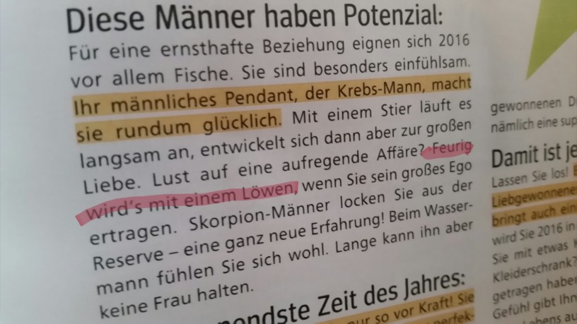 Die Erwerbsarbeit an sich zeichnet sich durch Arbeit aus. Lediglich der Abbau von Überstunden ist durch eine eher passive Tätigkeit charakterisiert. Meine Mitbewohnerin ist in diesen Minuten eher passiv: Während ich ein Kompendium über die Pest im Mittelalter lese, die man aus guten Gründen nicht mehr mit Aderlass bekämpft, liest sie mit dem Ziel der geistigen Zerstreuung ein Magazin, dessen Autoren man über ihre Ader entlasten sollte. Denn ich bin cain Freund dieser Printprodukte im „Pocket-Format“. Bis jetzt. Denn sie stieß auf ihr Jahreshoroskop für 2016 und ich darf an dieser Stelle verraten, dass sie Krebs ist und ich Löwe bin. Kann das passen? Stimmen Horoskope überhaupt?