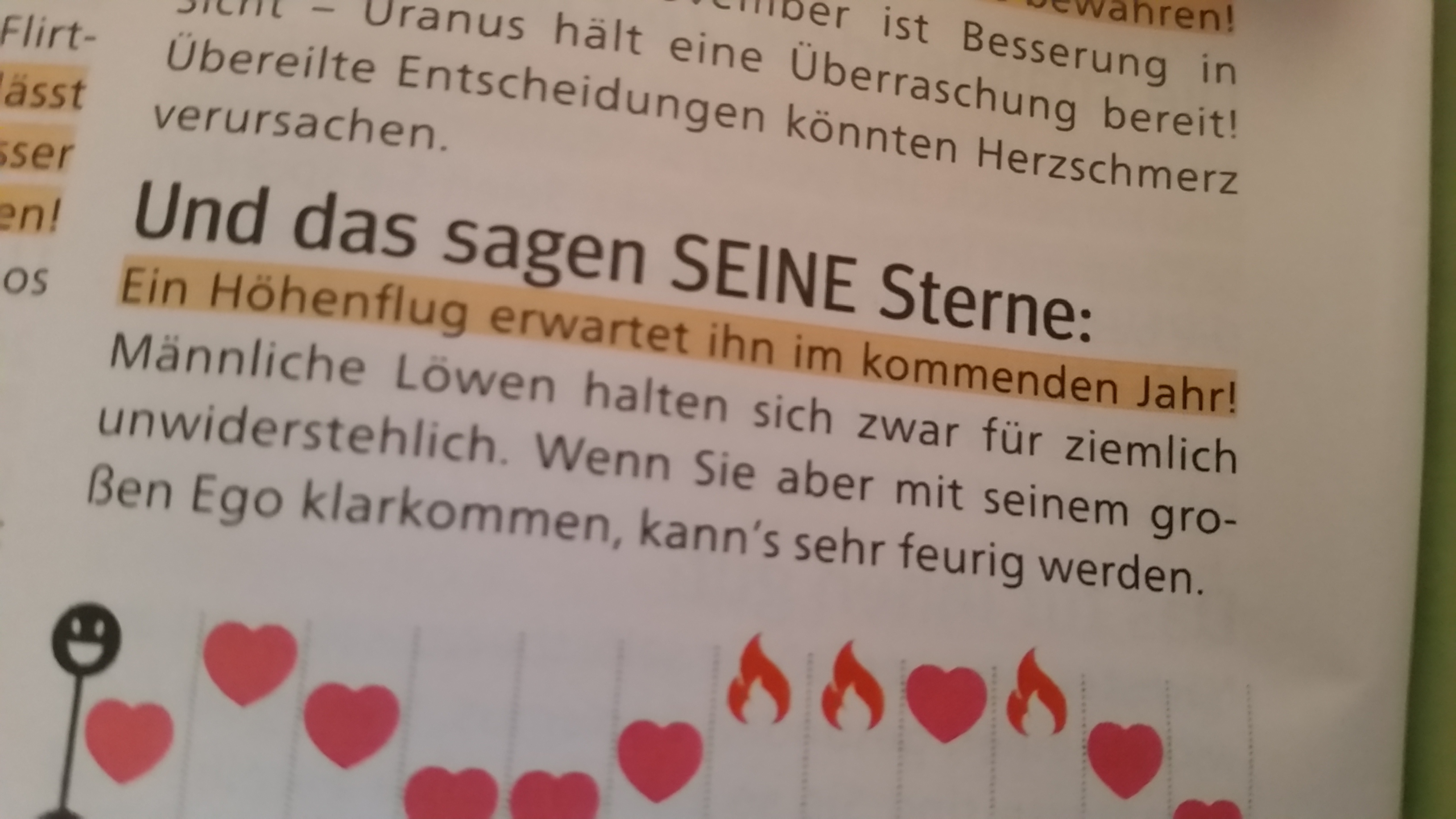 Jenes „Pocket“-Magazin, das hier zitiert wird, richtet sich an die Damen, hat aber auch zumindest ein paar wenige Sätze für den Herren übrig: männliche Löwen hielten sich für unwiderstehlich und hätten, Redundanz aus Kostengründen, ein großes Ego. Mich erwarte ein Höhenflug.