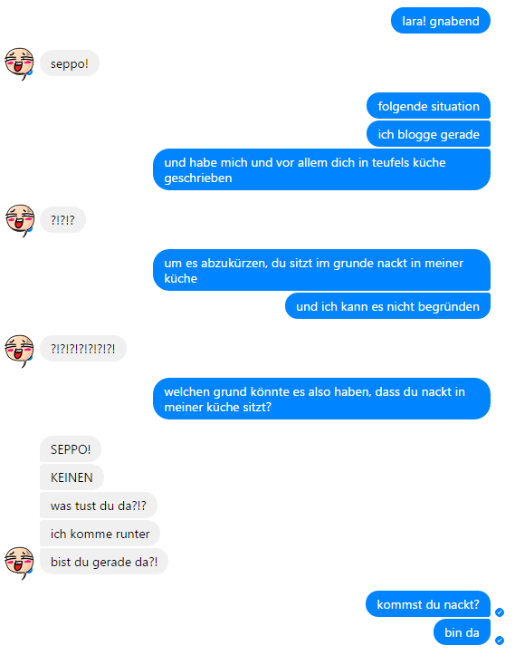 Ich zeigte Lara das Machwerk, auf das ich ziemlich stolz war und sie sah, dass ich sogar unsere Facebook-Unterhaltung in den Text hineinkopiert habe.