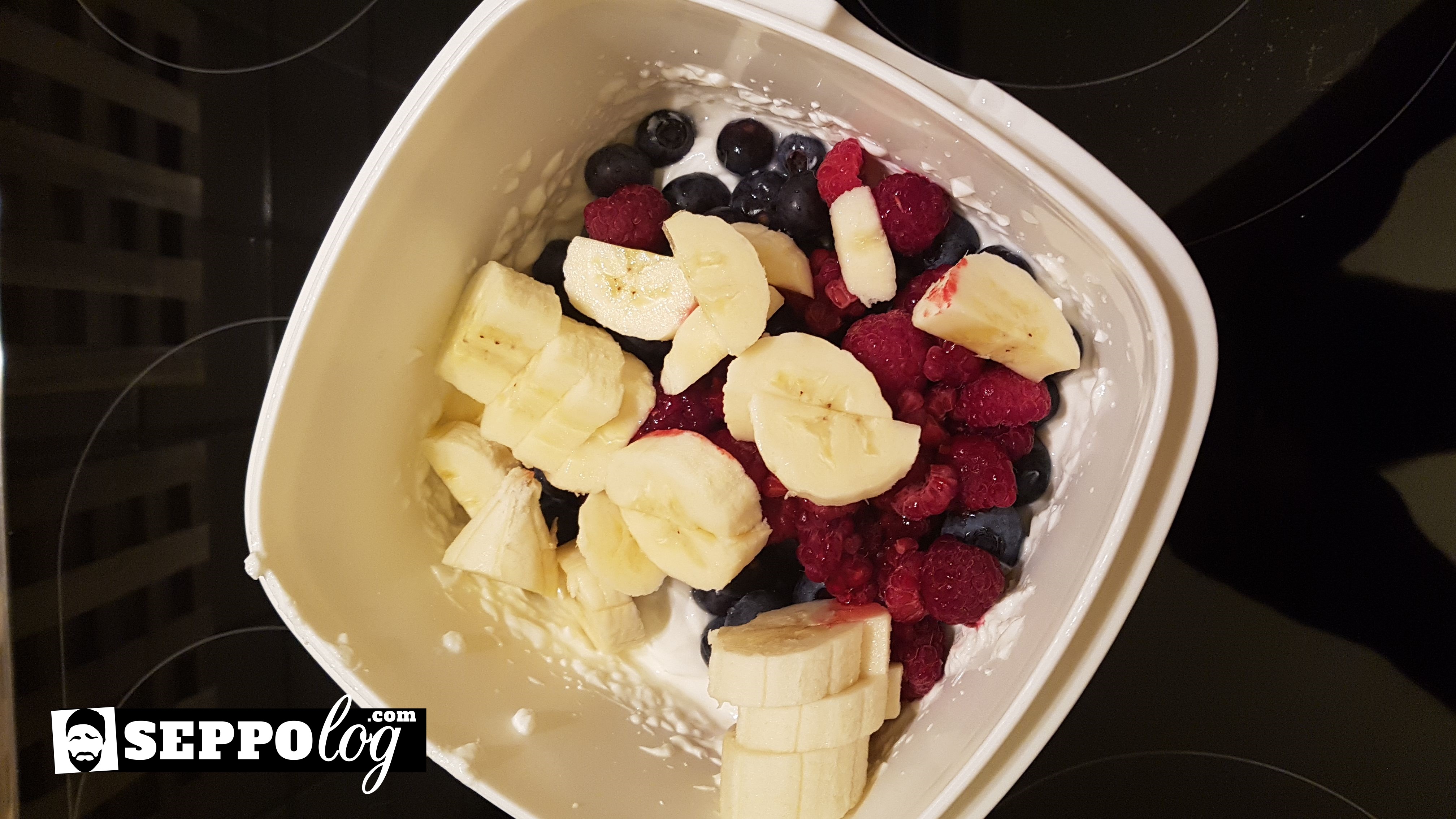 Es handelt sich um Magerquark mit schockgefrorenen Früchten, wovon ich die Banane ausnehme. Ich mag keine Bananen, aber mein neuer Impuls verlangt es eben, Grenzen zu überschreiten. Pro Kilogramm Körpergewicht, 73 habe ich davon insgesamt, soll ich pro Tag nun ein Gramm Eiweiß zu mir nehmen. Und das am besten eine halbe Stunde nach dem Krafttraining. Die beanspruchten Muskeln, so habe ich gelernt, „reparieren“ die feinen Risse in den Muskelfibrillen (die sehr wahrscheinlich die seit langem gesuchte Ursache für Muskelkater sind) mit: Eiweiß! Und exakt auf diese Weise wachsen Muskeln.
