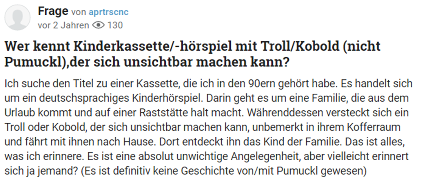 Ich kann nun nicht mehr rekonstruieren, warum, aber plötzlich fiel mir ein, dass in jener Geschichte Figuren mit den Namen Gunnar und Rasmus vorgekommen sein müssen. Half mir aber auch nicht, zumal ich jetzt weiß, dass es kein Rasmus war, sondern eine Frau Rasmussen. Was mir allerdings half, war die sich dazu gesellende Erinnerung, dass es irgendwie um einen Kobold ging. Pumuckl?! Nein, das hätte ich noch gewusst, von dem hatte ich zahlreiche Hörspielkassetten. Troll! Es war ein Troll! Ich bemühte wieder Google und stieß auf einen armen Troll, der offenbar dieselbe Frage hatte wie ich: