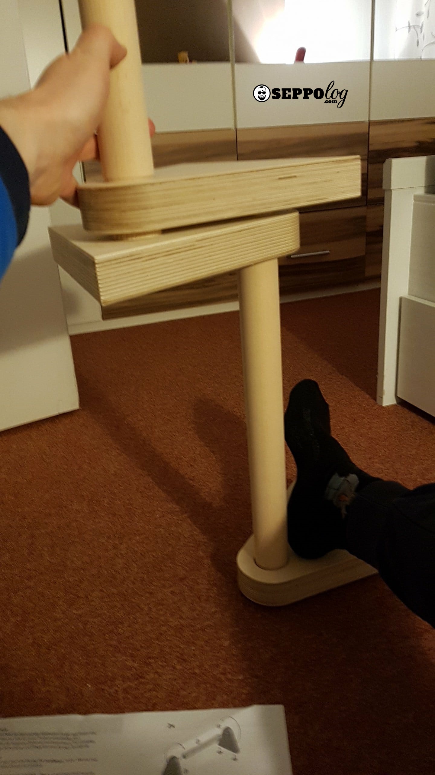 Man muss sich die Teile so vorstellen: An den zwei Enden der beiden Stangen ist eine Schraube. Diese schraubt man in die jeweiligen Gewinde der Füße. Ganz simpel. Doch schon nach dem ersten Versuch stellte ich mir die Frage, wie ich die sich jeweils gegenüberliegenden Füße ansetzen muss, damit sie am Ende genau dann fest im Gewinde verschraubt sind, sodass sie beide in der gleichen, parallelen Position stehen?! Denn meine ersten Versuche sahen so aus: