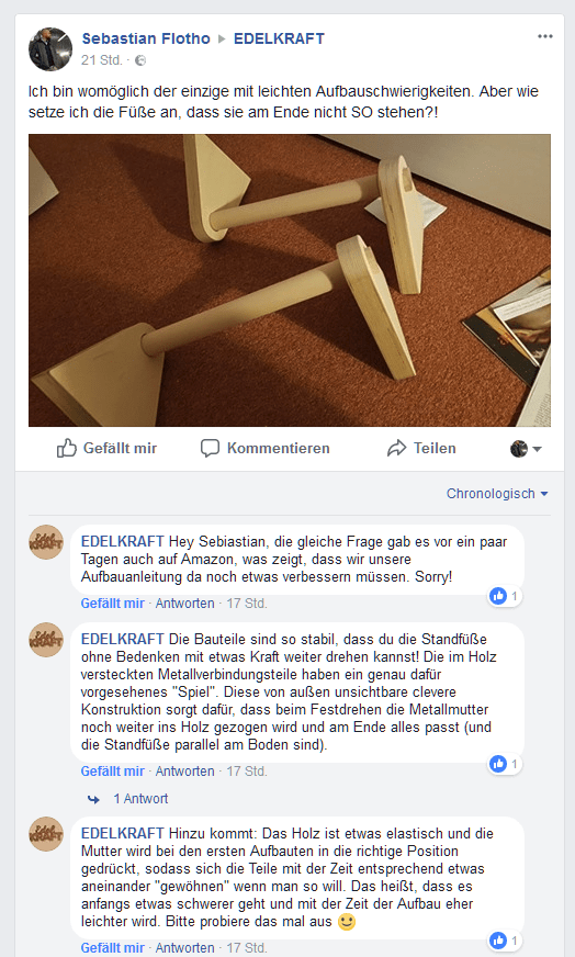 Ich versuchte es dann aber doch mit einer direkten Ansprache des Herstellers auf dessen Facebook-Seite. Relativ zügig bekam ich eine Antwort.