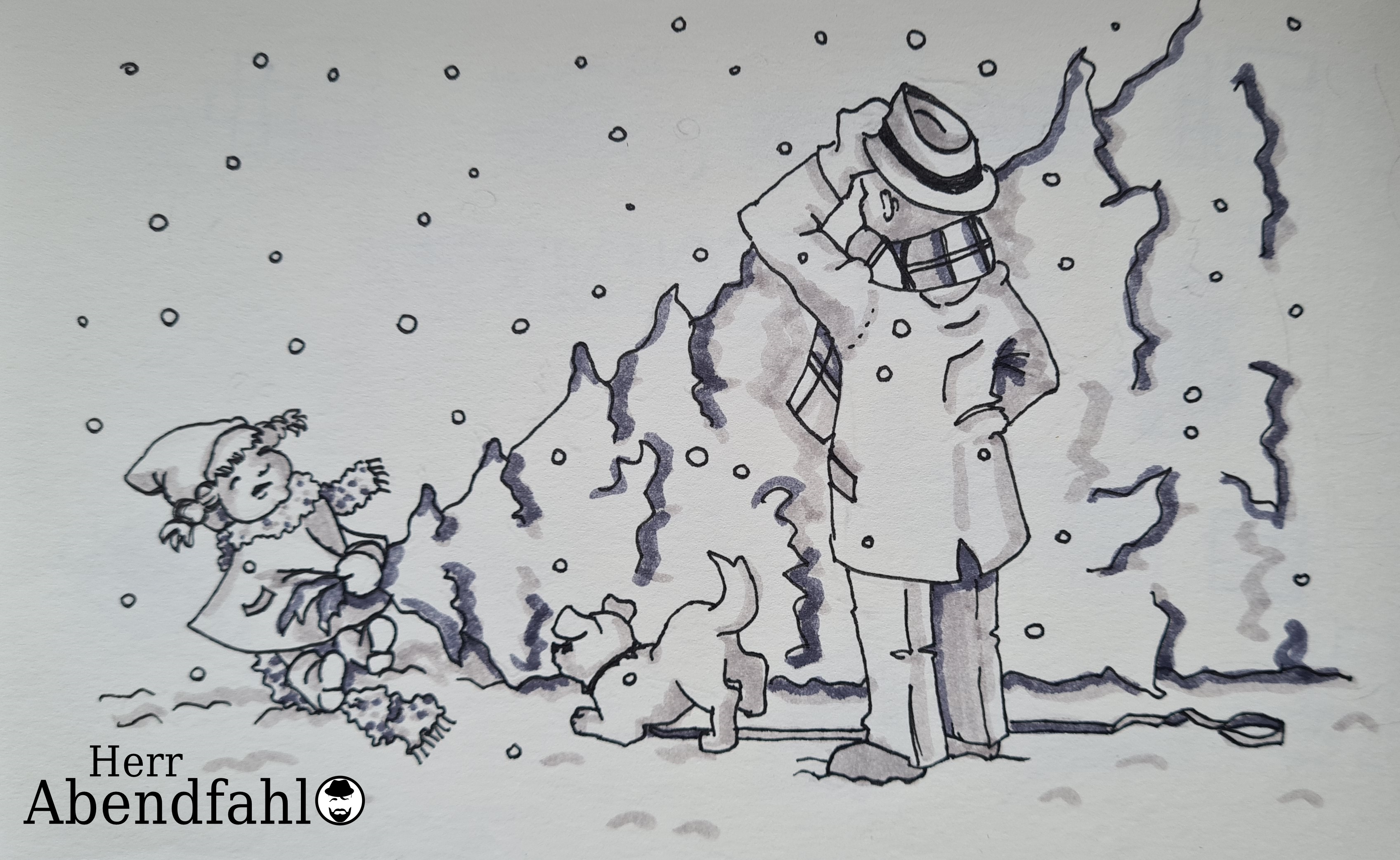 „Das, mein Freund, ist Schnee“, murmelt Herr Abendfahl Hupe zu, der abermals mit schiefem Kopf diesen fragend anblickt.