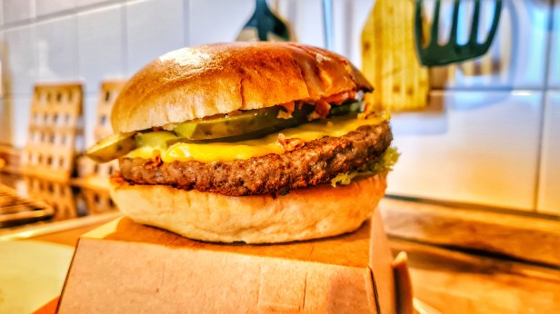 Ein „Peter Pane“-Burger und deren Burger halte ich für die besten. Sehen Sie diesem sein Erscheinungsbild nach, er lagerte eine Nacht lang in einem kleinen Schuhkarton, doch ich werde ihn angemessen aufwärmen. Ich darf ihn nur nicht im Ofen vergessen …